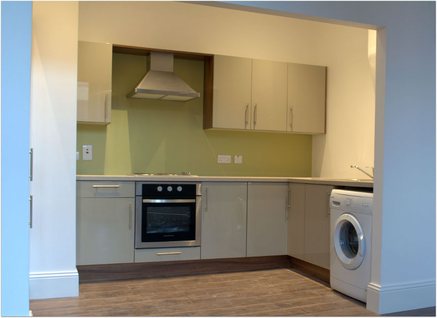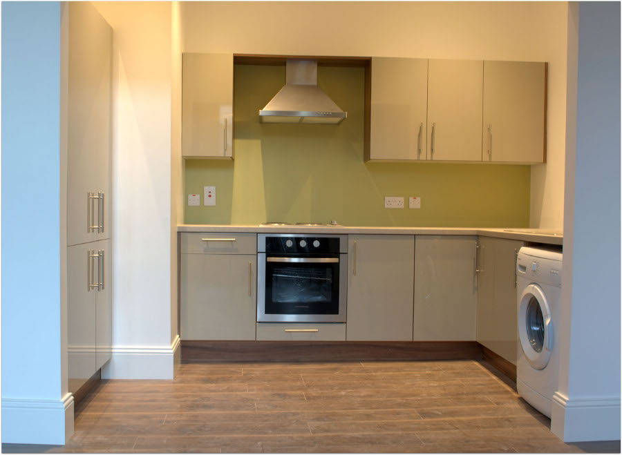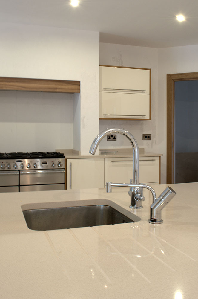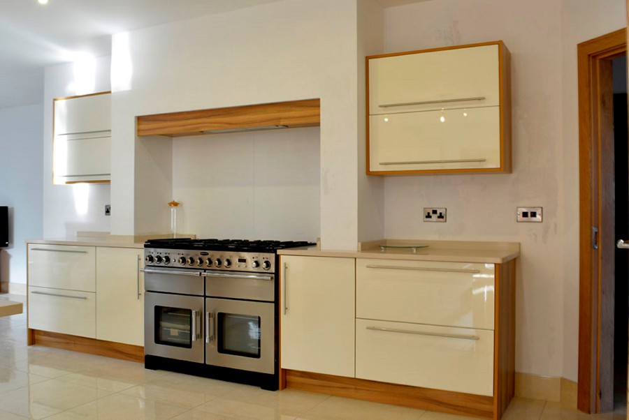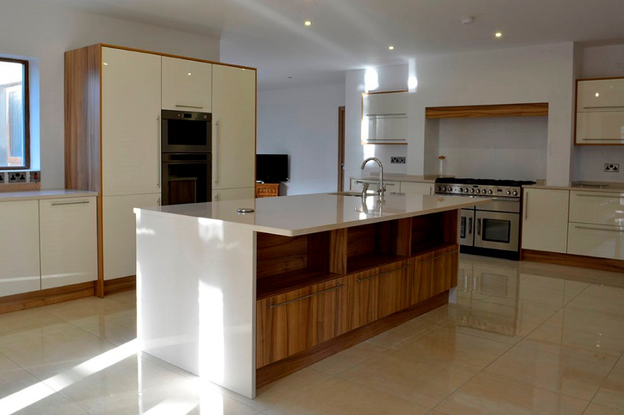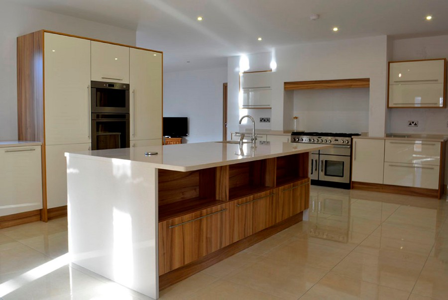 The modern clean lined design of this kitchen is achieved using the lacquered Ivory gloss doors trimmed with Lyon walnut. The worktop is a