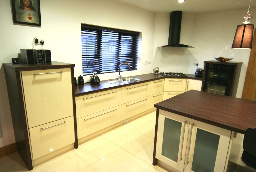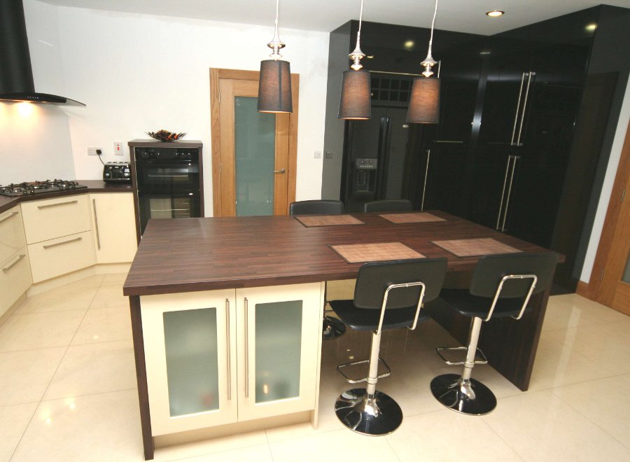 In this modern new build house in Buncrana, the hi gloss ivory and black kitchen sits