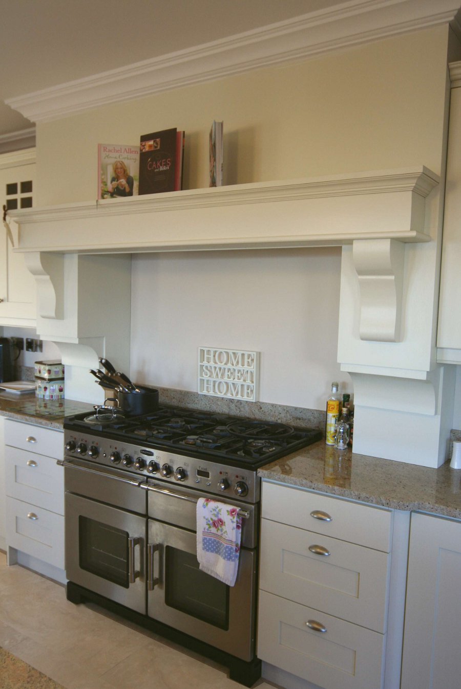 The island stores all the baking ingredients whilst the overmantle has clever storage